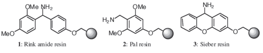 在 C 端肽酰胺的合成中,常用以下树脂。这些树脂与首个氨基酸的结合与 Fmoc 合成策略基本一致,且这类树脂在 TFA 的作用下,留下酰胺键完成切割(树脂类似保护基)。这类树脂由于裸露氨基,因此通常会采用 Fmoc 进行保护,使用前先进行脱保护。需要注意的是,对于 C 端空间位阻较大的氨基酸与树脂结合时,反应可能转化不完全,可能需要二次偶联步骤。