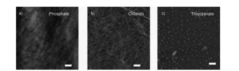 图1 在存在 A)磷酸盐、B)氯化钠盐和 C)硫氰酸钠盐的情况下自组装肽凝胶的原子力显微镜图像。比例尺代表 500 纳米。