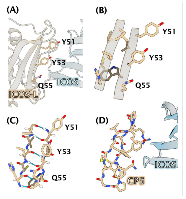 图1 参与ICOS/ICOS-L相互作用的关键残基及环肽设计。(A)ICOS(棕色)和ICOS-L(蓝色)的界面(PDB:6X4G)。ICOS-L中主要负责结合的三个残基被突出显示并标注:Y51、Y53和Q55。(B)ICOS-L蛋白中β-折叠链51YVYWQ55的侧视图以及相邻的反平行β-折叠链112HCLVL116。(C)我们旨在环肽设计方案中保留的六个氢键相互作用(蓝色虚线)。氧、氮和硫原子分别以红色、深蓝色和黄色显示;NH和Hα原子以白色显示。(D)与ICOS结合的CP5的结构。该CP5/ICOS结构是通过将MD模拟中未结合的CP5结构与ICOS/ICOS-L共晶结构中ICOS-L的β-折叠链51YVYWQ55的主链原子对齐而创建的。
