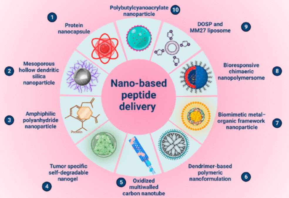 图1 纳米胶囊、介孔二氧化硅纳米粒子、聚合物纳米粒子、纳米凝胶、碳纳米管、树枝状大分子、金属纳米粒子和脂质体。上述纳米载体可用于肽类药物的递送,从而靶向肿瘤部位。
