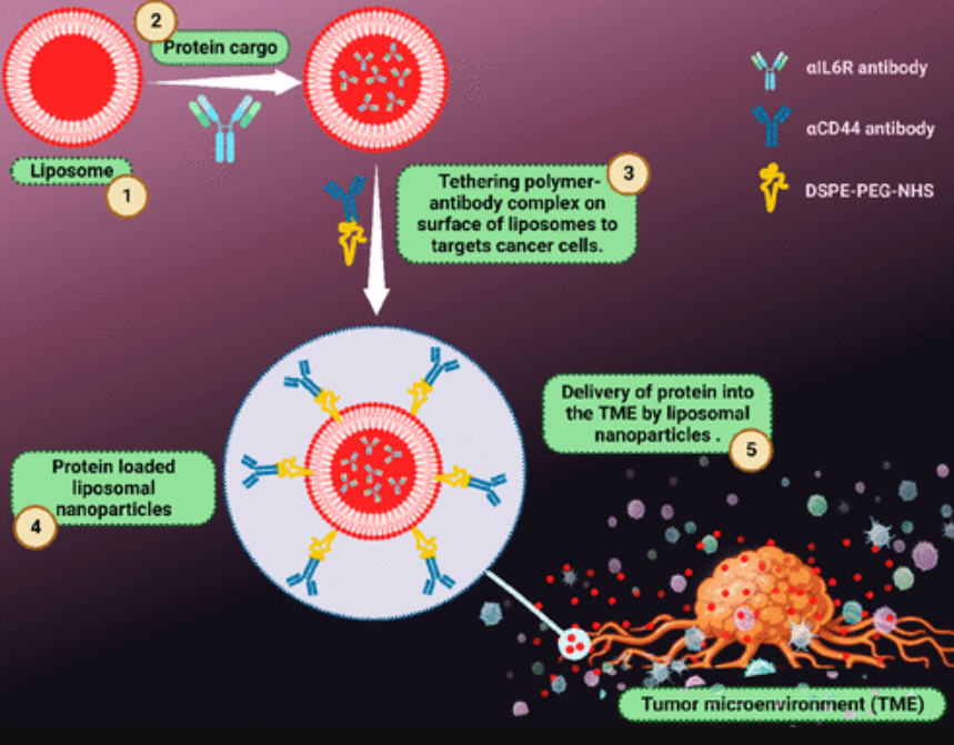 图2 纳米载体(脂质体)负载蛋白质的示意图,通过在脂质体表面装饰抗体复合物,进一步增强其向肿瘤微环境(TME)的靶向递送。